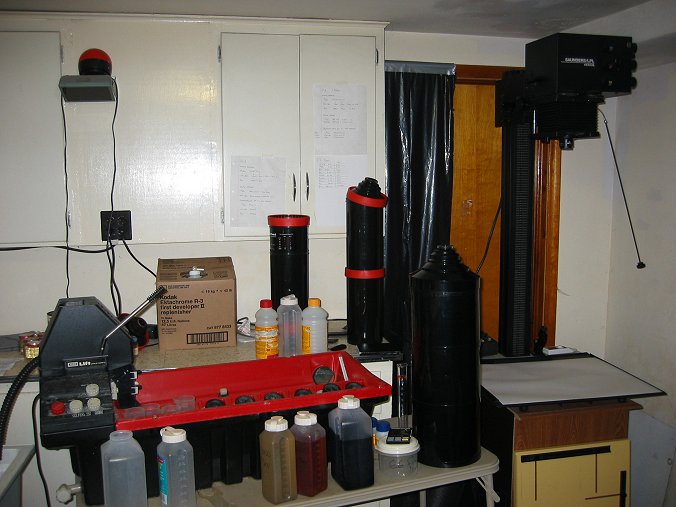 For example, here is my home large-format color darkroom. To the right is a Saunders 4x5 enlarger. In the center you see the Jobo CPA processor (will handle processing tubes for both film and paper up to 20x24 inches). You can see both the 16x20 paper tube (long thin on in the back with an orange ring in the middle )and the 20x24 tube (largest black tube). Not pictured are the sink and large basins for rinsing prints, the chemical storage closet, the dark closet for storing papers of various makes and sizes, and the numersous accessories that accompany the enlarger (film holders, lenses, alighnment tools). This photo represents about $2500 worth of equipment. So, you want to give it a try. Well, first you'll need a camera and a lens. Get something used, 4x5 format. You can get a pretty nice used Graflex Speed or Super Graphic camera on eBay for about $400. These will typically come with a lens in working order, and maybe a couple film holders. You can use your SLR for the meter. Graphlex cameras will resale for what you paid, so don't worry too much that you'll get a camera you can't get rid of (they haven't been produced since 1973, so the market had pretty much stabilized a decade ago). These are metal cameras that stand up to abuse fairly well. Any lens in the 120 to 140mm range will do nicely. Film. Try your hand at B&W first. You can develop these at home with minimal trouble, and then contact print them (but I'll warn you now it will only make you hungry for bigger prints).