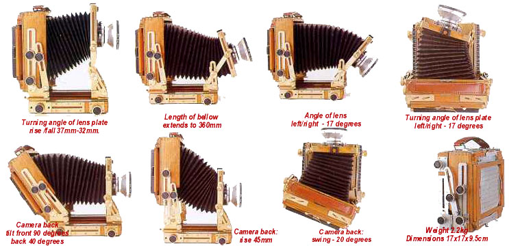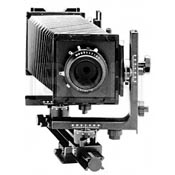 Photos courtesy B&H Photo, the best mail order house in the US. MovementsMovements. The real advantage large-format cameras have over fixed-lens cameras (both small- and medium-format). Movements mean to move the lens relative to the plane of the film. SLR cameras have a fixed lens, so the focal plane is always parallel to the film plane. This means that an SLR can deepen its focus only by closing down the lens and increasing the DOF. But large-format cameras are not restricted this way. If I need to focus on an interesting design in a dried mud flat, I can tilt the lens forward a bit, which moves the plane of focus down also. If the mud is flat, I can have the entire mud flat in focus with the lens wide open! When I close the shutter down I am still widening the depth of field, but now it is getting wider relative to the new plane of focus (up and down in this example). So by using lens tilt I can make up in large part for the lack of DOF the longer lenses have.