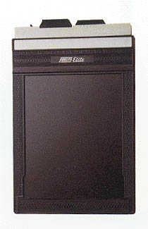 Barrel lenses. Some lenses don't need or use a shutter. They will have an aperture, but they depend on a shutter built into the camera body itself. The lenses are called "barrel lenses", and they only work with "press cameras", field cameras that have folac plane shutters (the very-available Speed Graphics are the best example). Barrel lenses are cheaper because of the fewer operating parts. Because the film is so much larger than 35mm frames, focal length is also extended. A 90mm LF lens is equivalent to an 28mm lens on your SLR. And a 210mm lens is equivalent to a 70mm. And as with all longer lenses, the depth of field becomes much narrower, so the lens must be stopped down much farther than you are accustomed to in smaller formats (f/16 to f/64 is very common, rarely anything wider is used). But the depth of field problem is nearly as bad as it seems, because with camera movements the plane of focus can be moved anywhere you need it, compensating for the DOF limitations of these focal lengths. Film Holders. There are two types of film holder being used for sheet film, plus roll holders that fit on the back of a camera for exposing 120 roll film.