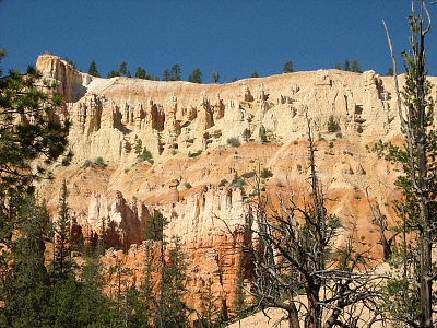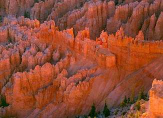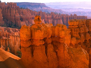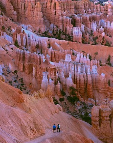 these shots. I've found it's best to wait a few minutes for the sun to get high enough to shine onto the hoodoos brightly enough to have them reflect that red light on the shadowed-sides of their neighbors. Then you'll get shots with low enough contrast for slide film. By the way, the photograph on the front of the Bryce Canyon Official Map and Guide, the photo we all want to get, was shot about 30 minutes after sunrise from Bryce Point, and has the sky cropped out. You'll need a 2-stop hard-edged ND grad if you want the sky. While you are at Bryce Point, look across the canyon to Sunset Point (you'll know where it is because of all the tourists using flashes). Now imagine getting from there down to the bottom of the canyon. That's what you're about to do! Mid Morning There is