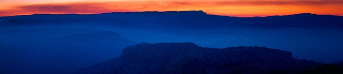 There is a wind problem at Bryce Point. If you stand near the fence, your camera will be buffeted by the rather strong updraft. If you move back three feet you won't feel much of this wind at all. Try to keep back a bit, but it's tricky if the point is crowded and tourists crowd in front of your camera. Fortunately most of them are waiting for the sun, and aren't interested in shooting in the best light for the canyon. Practice your best manners here, chat with other photographers and if you are shooting large format, leave the shutter open so any interested party can look at the focusing screen; they're dying to get a look, and it's a great way to introduce yourself to them. Also, and I really don't like saying this, you'll need to avoid the Wallies. They are the ones dressed funny and are looking at the crowds, not the scenery. Wallies are named after the Wally character in the movie Crocodile Dundee, who talk big but know little, who like to position themselves in prominent tourist locations and talk like they know the area. They never do (I once heard a Wally tell a poor German fellow who was too kind to walk away about the animals in the area, the bobcat, the 'coon, and the varmint; I think he meant the coyote, but he didn't describe it very well). They will be an endless distraction if they start talking to you. They inhabit the viewpoints mostly in the afternoon and evening. Well, you've been warned. From some of the other viewpoints you will get different vistas, but they are all similar in coloration and shadow depth. Dawn The sun rises over the Aquarius plateau (actually, it comes up over the Escalante Mountains and Powell Point, but many consider this formation part of the plateau; I don't) about 10 minutes after the official sunrise time reported on my GPS or posted at the visitor center. The sunrise is actually a little better from April to May and in September when the sun come up through a notch between Powell Point and Boulder Mountain farther to the East, giving a little more color to the light and a little better angle for cameras at Bryce Point. The dawn
