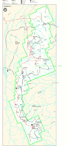 Bryce, at 8000+ feet, gets cold in winter. Camping is still available in part of Loop A in the North campground (heated restrooms!) but is limited to about 15 sites, which will fill up on a holiday weekend. The visitor center will provide free snow shows (with credit card deposit to cover damage and loss) when the snow is a foot deep or more. If there isn't much snow the road to Rainbow Point will be open and plowed, but typical winters will have the road closed either at Fairview Point or just past the turn to Bryce and Inspiration Points. Paria Overlook is closed for cross country skiing. The Lodge is closed from November 1st, but many motels outside the park remain open year round. During winter the full moon rises above Powell Point, a very nice shot from Inspiration one day before the full moon peaks. In winter, the viewpoints to the south of the amphitheater usually look best in the mid morning, when the brightly-illuminated hoodoos can compete with the brightness of the snow. Under the Rim If you like backpacking, and have a camera system set up for backpacking, then the Under The Rim trail is for you. You need a backcountry permit from the visitor center (they are free), and you can get some nice shots of the pink cliffs from below (the ones most of us never see from on top of the plateau). Make sure you have a good trail map, like the National Geographic Trails Illustrated map of Bryce Canyon (map number 219). Outside the Park, Red Canyon There is one more place for shots, Red Canyon, the one you passed through on your way in from Pangwitch. I've found that mid-morning shots are good here, and that a polarizer can make these shots in the North side of the canyon very colorful indeed. Many shots can be had using a telephoto from the side of the highway, but there are some trails that get you right up to the canyon walls. A couple things to note about the red Canyon State Park, there is camping (37 sites), showers (more accessible than the ones in Bryce), and mountain bikes are allowed on the trails (good if you bike, bad if you don't like being surprised by bikes heading down). Outside the Park, Kings Creek Bryce sits on the very edge o the Paunsaugunt plateau. If you'd like to see what the middle looks like, you might want to stay at Kings Creek campground, in the Dixie National Forest. You access it along a dirt road off Highway 12, about 3 miles to the West of the Ruby's in turnoff. The campground it located next to Tropic reservoir, about 11 miles down the dirt road. It's a heavily wooded area, rather like the Sunset campground area in Bryce, only more so. I don't know of any spectacular shots from the area, but it is a nice campground, away from most of the tourists. The drive along the dirt road to the South is an interesting one, following the river valley back into the forested mountains. Outside the Park: Losee and Canto Canyons (This section added February 2003)