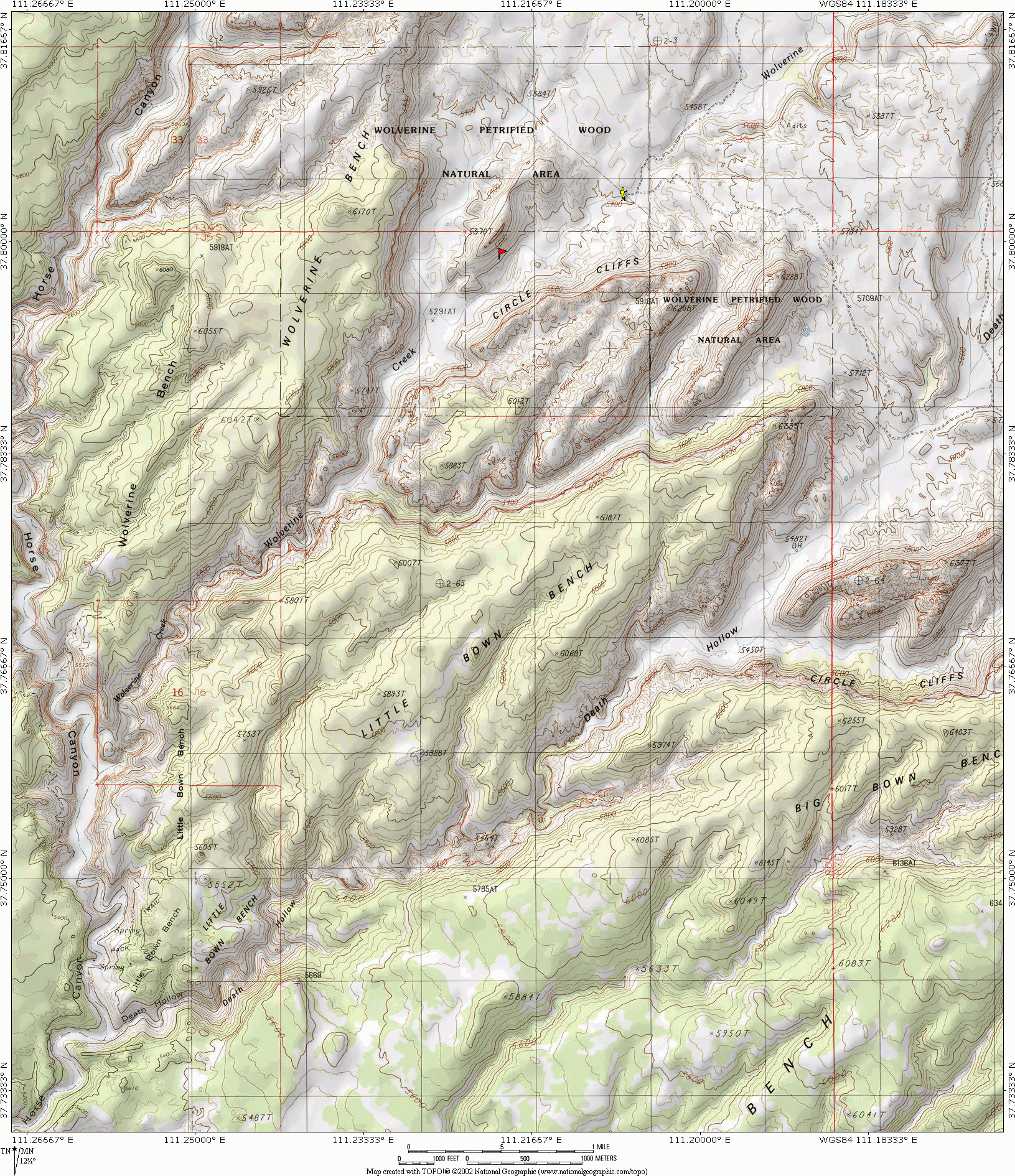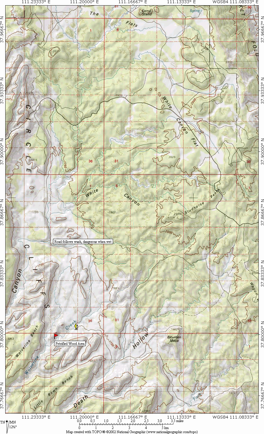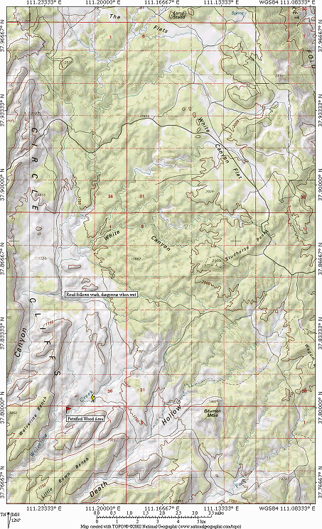 road all the way down the hill, so do explore. There must be other locations similar to the end of Long Canyon for shooting the cliffs at sunrise, but none of them are nearly as easy to access. Driving the dirt roads in the area at night is discouraged unless you are very familiar with them. The Burr Trail: The Flats The area enclosed by the Circle Cliffs doesn't have a single name. Generally called "The Flats", it is composed of an area called The Flats to the north of the road, White Canyon Flat toward the east where the road passes through, and White Canyon in the middle. To the south is Horse Canyon, the Wolverine Petrified Wood area, and Death Hollow, all in close proximity. The flat is a fairly photogenic Upper Sonoran environment, cut with many eroded drainages and filled with juniper and pinion pine trees (which I grew up collectively calling 'cedars'). The north, south, east, and west sections of the flats all have their own 'feel', and it's the eastern par I like to photograph best. The area has many ungraded dirt roads (put in by uranium miners a long time ago, used mostly for RV and hunting now) that provide access to the more remote parts of the flats and a few of the hilltops, but a 4WD vehicle is needed to traverse the roads. I don't know of any really grand views of the flats as a whole, as there do not seem to be any trails that lead to the top of the Circle Cliffs. With a long lens you can get an oblique angle on the flats from the Homestead viewpoint on Boulder mountain, but you will content with haze from that distance. Instead I like to find those fun, interesting little pristine still life's that are most easily found on the less-frequented eastern side of the flats. Here is where the crypto grows in abundance, so again, be very careful of where you step. One interesting spot I found on my last visit is the car wreck. Look for a lone burned tree. A car wrecked there in the past (sorry, I haven't discovered the details) and burned. There I found molten aluminum, fused glass, assorted bits that fall off cars when they are destroyed. Not photogenic, just interesting. The Wolverine Canyon area, and Death Hollow Probably the most interesting location in the flats is to the south, the Wolverine Petrified Wood area. You access it via a mostly graded dirt road. Looked for the signed turnoff to the south toward Wolverine and Horse canyon. The road is in very good shape until you reach the wash, where the quality deteriorated rapidly. It is passable by passenger car in dry conditions, but impassable by anything when wet. Near the washes are some dust bowls in the road that can unnerve all but the most steady drivers, which are not dangerous (besides coating everything with thick layers of dust). At the southern most end of the road is a large parking area and a gate to access the petrified wood area. Bring water, as you will need to hike a bit to find the best locations.