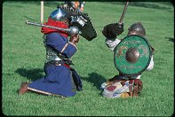 Having been hit in the right arm, Sir Tarrach continues the fight with the left. Her Highness,  Princess Kelinda Garrett, thanking chirgeons Lady Sian verch Gruffydd and Alexander for so ably taking care of everybody.