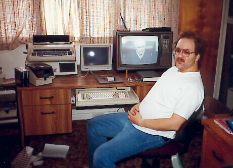Here are a bunch of pics I've taken over the years of my family. If you weren't there, they won't mean anything to you, so you might go on to one of the other, more general photo pages. These are old photos, and I didn't try to optimize the scans, so if they look odd, live with it. If you are a member of my family and you want a better version of any of these, let me know. I have the full-sized scans and can fix those up for you. My brother Ross just got a new corner office. Can you tell?