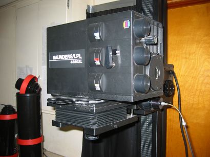 The next step up would be automatic rotary-tube processors, where the entire process can be programmed, and the machine will handle the rotation, filling and dumping of chemicals and rinses, the entire process. They get pretty expensive. The top of the line in home processors are the line processors. These are a series of chemical tanks, all light-tight, with a transport mechanism to move the paper from one bath to the next. Used primarily in pro labs, they consume a lot of chemicals, and must be kept running constantly to be used efficiently. They are rarely found in the home darkroom. The second piece of equipment is the color enlarger. Designed exactly like the B&W enlarger except for the light source, they tend to be made by the same manufacturers and will be a little more expensive. All color enlargers are of the diffusion type, and have a color filter system built into the light source. The lamp, usually a halogen lamp, shines through a set of three dichroic filters (for this reason color heads are often called dichroic heads). Dichroic filters are made of glass. They have been given a transparent coating of a very exact thickness, just right to allow only one wavelength (color) of light to pass through. The three colors are magenta, cyan, and yellow (to the eye they look green, red, and blue, respectively, because those colors are being reflected off the filter and not allowed to pass). Dichroic filters are used because after extended exposure to bright lights they will not fade. The filters are typically held out of the light path until they are "dialed in". The front of the color head has three dials, M, C, and Y, for adding just as much or as little of each color as needed for the film and paper being used.