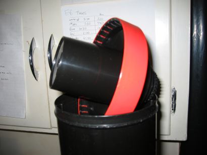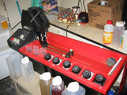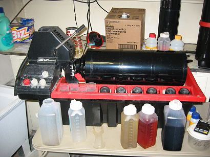 The next step up, and the one most home processors use, is the rotary-tube processor. This is a large water bath with room on the side to hold chemical bottles. The main part of the processor is a water tray into which the tube with your film is placed. At one end there is a rotating magnet or cog to which your tank will attach. The rotating motor will rotate the tube back and forth until you shut it off, so all the agitation is taken care of. The bottom part of the tube will sit in the water bath to maintain the temperature of the film and chemicals. Some processors also have a "lift", and device with a lever that allows you to tilt the film tube up and drain its contents. The lift also has a funnel-like opening to allow you to pour chemicals into the tube without removing the tube from the lift. Rotary processors are equally at home developing film or prints. Jobo is the most popular brand.