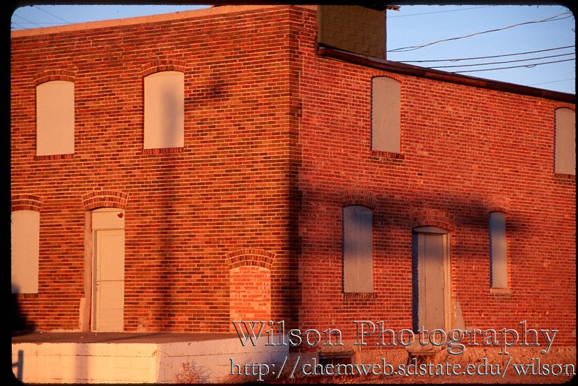 description = Shadow of R.R. crossing lights on abandoned building, Madison SD