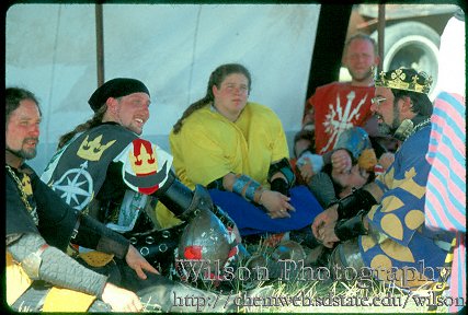 people = ...Lady Micheline Elphinstone of the Shire of Falcon's Keep, called Meehesh, looking pensive and soaking up the reflection off all the Brass Hats, A Lost Boy whose name I don't know, and His Majesty King Fernando of Calontir.