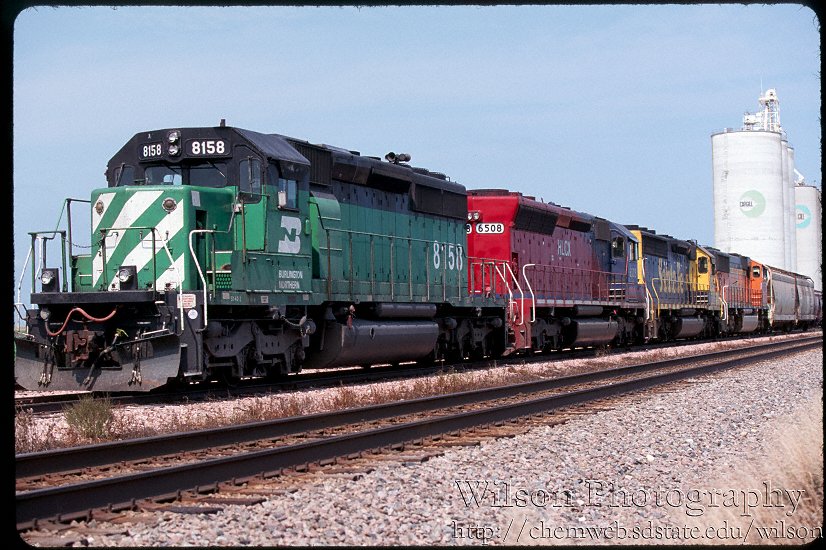 description = BN-SF locomotives loading grain south of Pipestone MN.