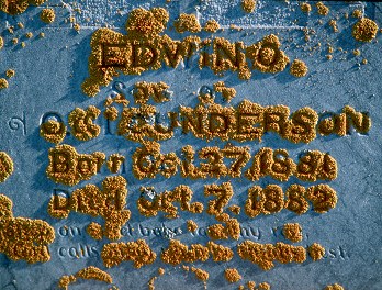 description = The tombstone of Edwin Gunderson, age 11 months, beset by lichen.