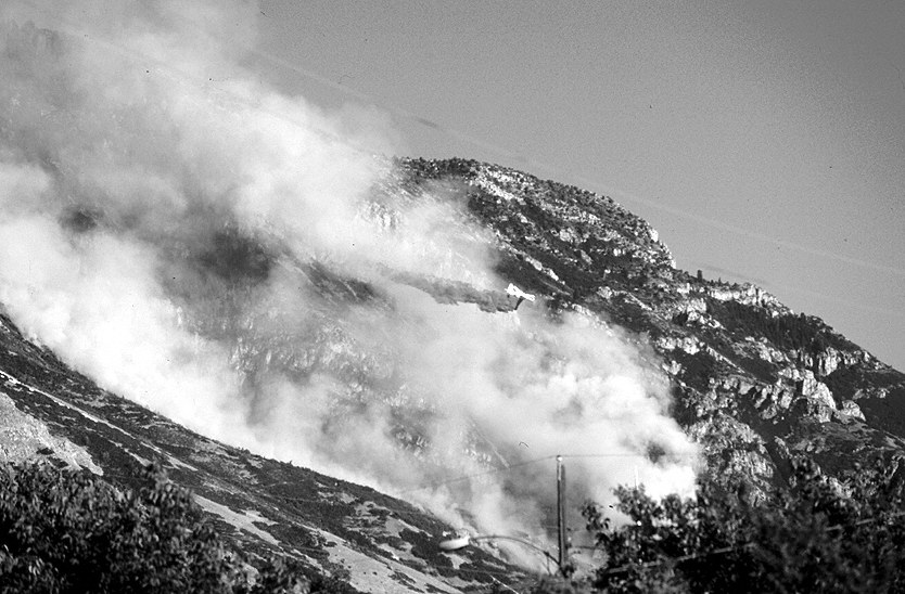 description = Forest Service plane dropping retardant on the Slate Canyon fire, August 2001.