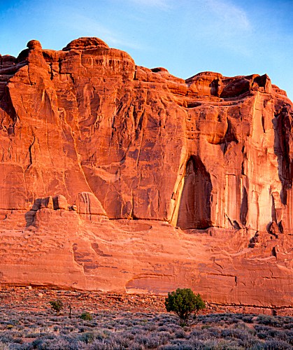 description = Sandstone wall and juniper tree, sunrise