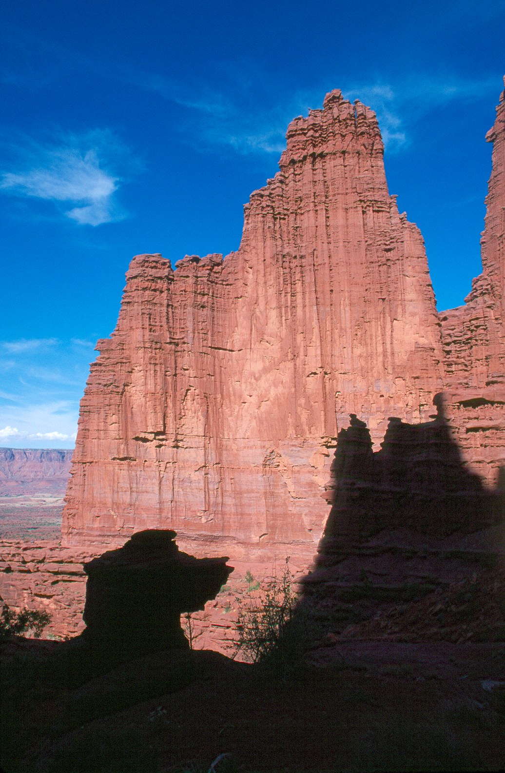 description = One of the Towers, sillouettes of sandstone formations, and the hiking trail barely visible at the base.