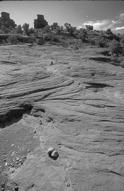 description = Weathered slickrock, and a stone cairn marking the towers trail