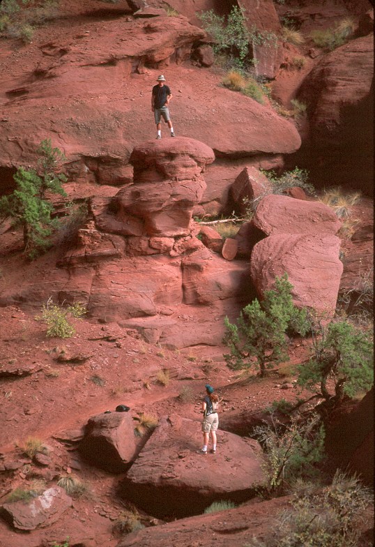 description = Two other hikers on the trail, giving a sence of the size of these sandstone formations. He is standing on a very small rise in comparison to the towers.