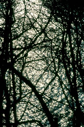 description = The Sun's reflection off floodwaters, shot through spring-bare brances