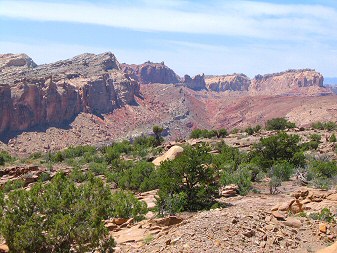 description = In the distance the Behind the Reef road climbs up the Kayenta shelf. Above is the Navajo, and below is the oddly-sloped Wingate. Below that is the Chinle/Moenkopi valley