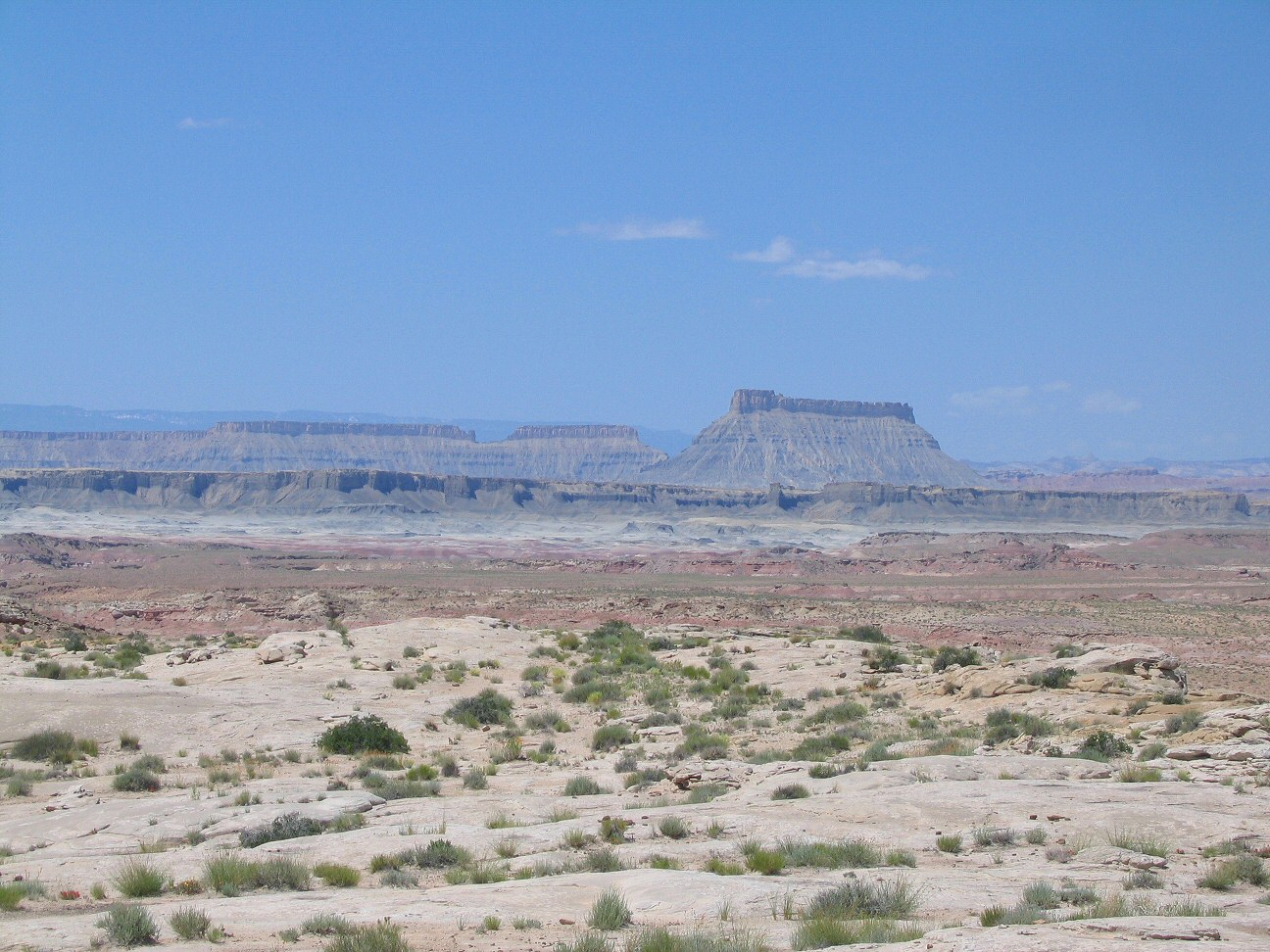 description = From Big Wild Horse Mesa, Factory Butte and the colorful Chinle formation below Skylline Rim in front of the Butte.
