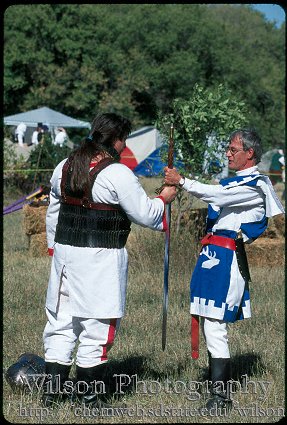 people = The winner of the Great Sword Tournament, being handed the prize.