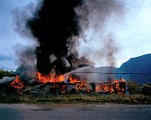 An old farmstead, shot in sunlight filtered through the smoke of a prairie fire. |