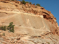 Cross-bedding on the sandstone, demonstrating the dune origin of this sand |
