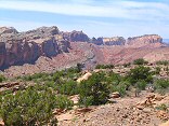 In the distance the Behind the Reef road climbs up the Kayenta shelf. Above is the Navajo, and below is the oddly-sloped Wingate. Below that is the Chinle/Moenkopi valley |