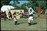 Jarl Sir Thjothrekr standing, Viscount Sir Ternon kneeling. |